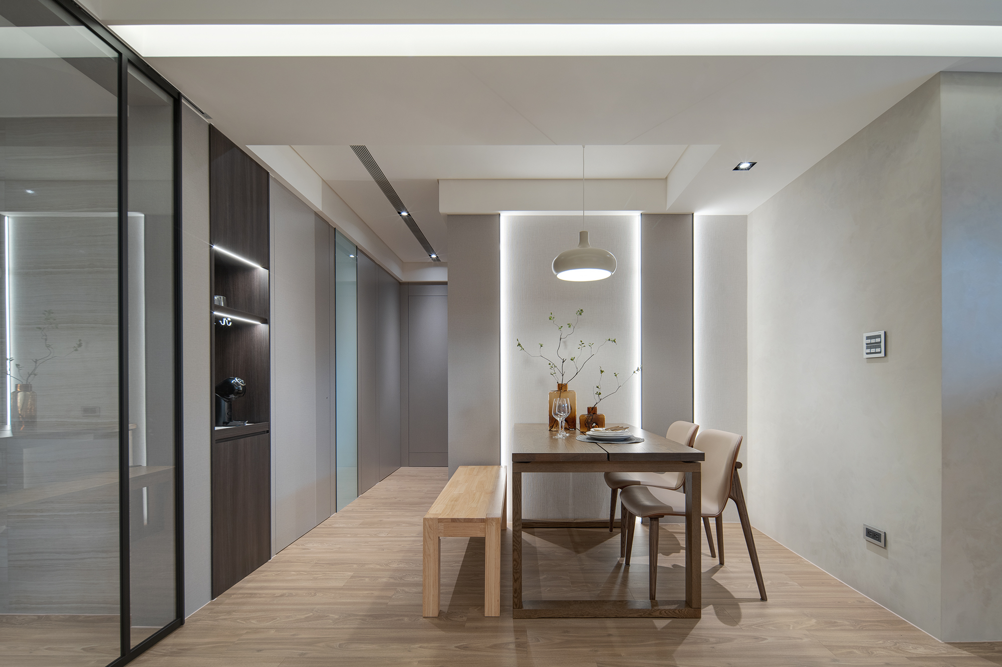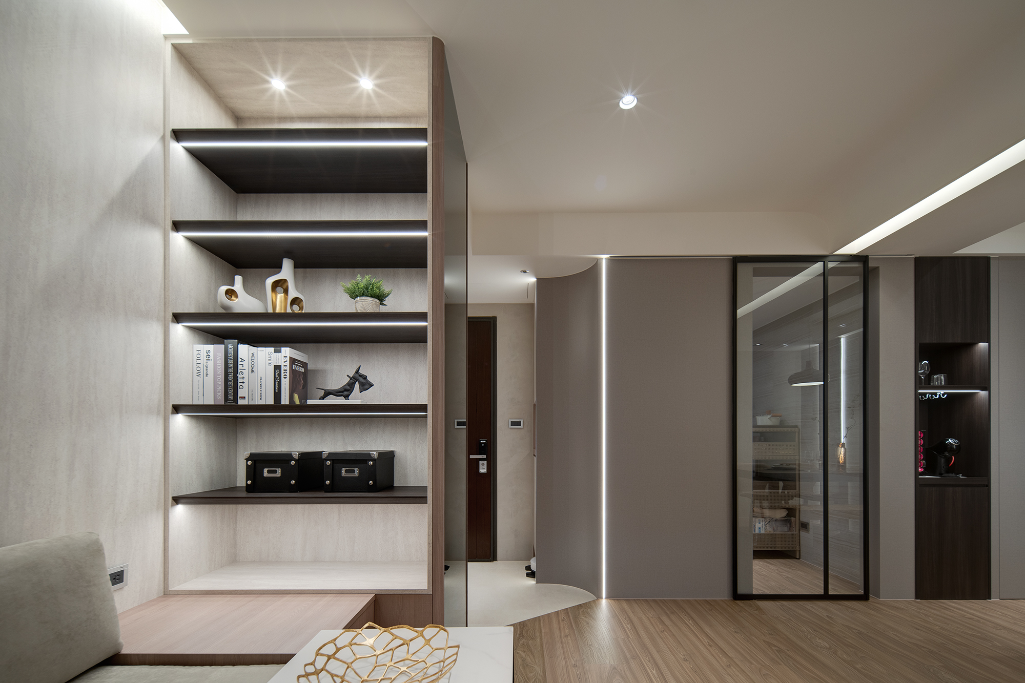 - 機能為本:內嵌櫃體與隱藏式設計將生活瑣碎隱於無形,室內氣象如留白畫作般整潔雅致。